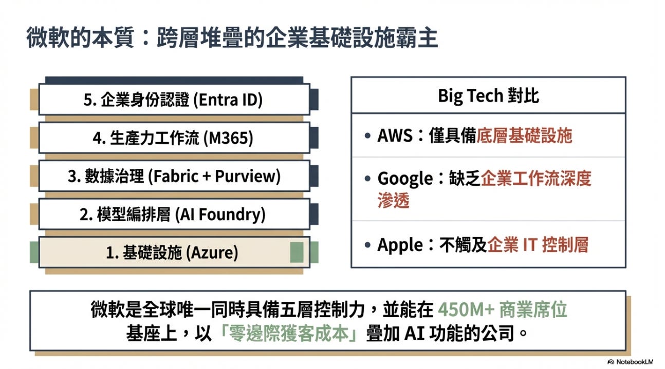 AWS 只控制基礎設施層。Google 強在模型與搜索但缺乏企業工作流滲透。Apple 控制消費硬體生態但幾乎不碰企業 IT。唯有 Microsoft 同時控制「基礎設施 × 應用 × 身份 × 數據 × 安全」五層,並且在 450M+ 的 M365 商業席位基座上,以零邊際獲客成本疊加 AI 功能(Copilot)。這是全球獨一無二的結構性位置 。
