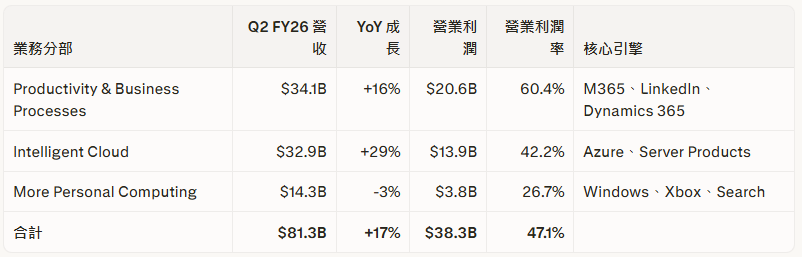 Microsoft 的營收分為三大業務分部: